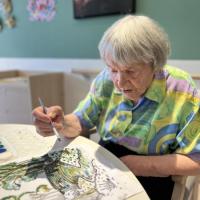 Publiée le 09/10/2025Quand on lui dit "c'est beau ce que vous faites" elle nous répond : "Jessaye" C'est avec modestie et douceur que Mme D, 94 ans, aime régulièrement se prendre à l'art de la peinture. Les soigantes qui l'accompagnent le disent, c'est un art qui l'apaise et sur lequel on la voit s'épano [...] Lire la suite
