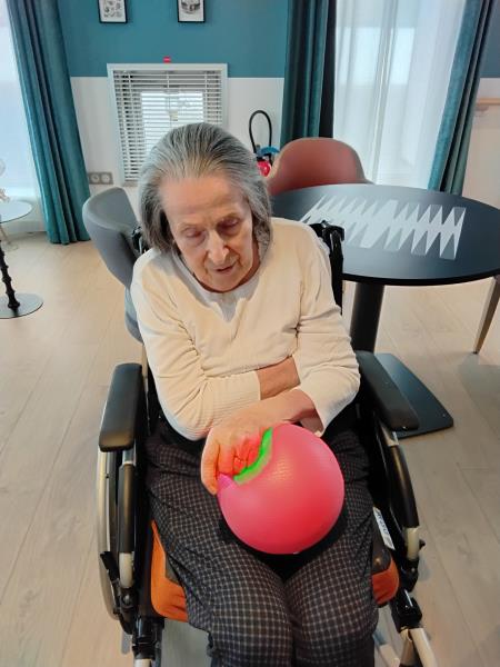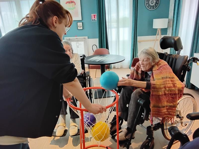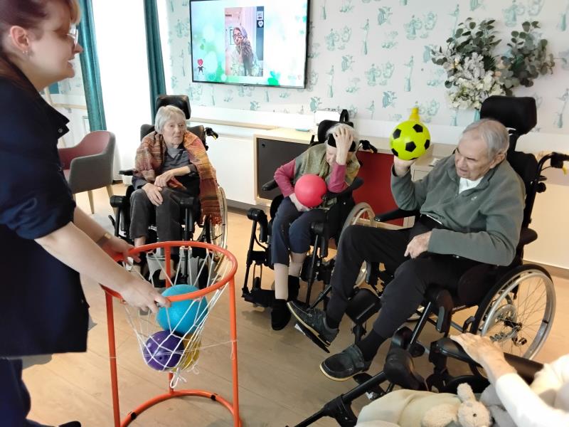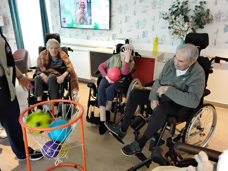 Aujourd’hui, l'animatrice et l'ergothérapeute, ont proposé une séance de motricité adaptée aux résidents les plus dépendants. L’objectif était de stimuler leurs réflexes tout en favorisant le mouvement dans une ambiance ludique et bienveillante.