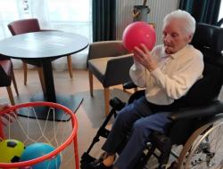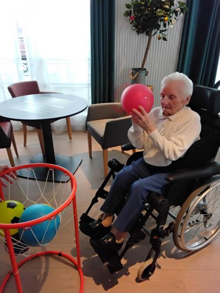 Pour cela, un jeu simple autour de la balle et du panier de basket a été mis en place. Chaque résident a été accompagné selon ses capacités, afin de participer à son rythme. Les gestes, même minimes, ont été encouragés, permettant de solliciter la coordination, la mobilité et l’attention.