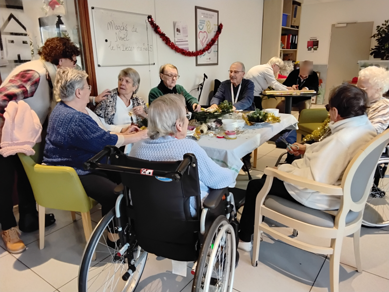 Les Résidents coopèrent deux par deux pour nouer le papier doré et confectionner les bouquets en branches de sapin.