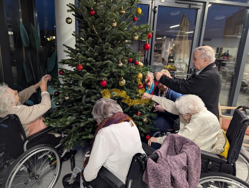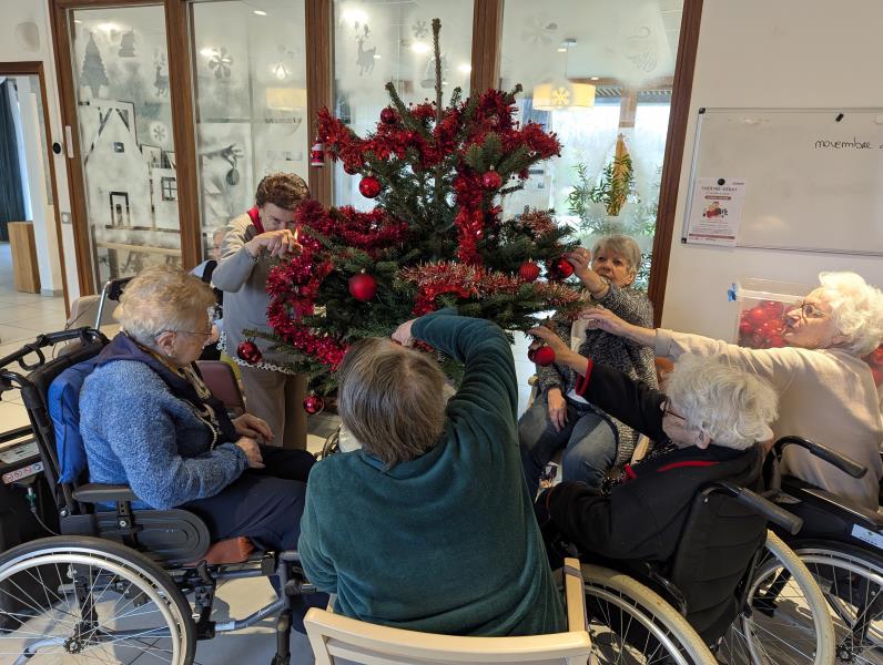 Dans un bel esprit de fraternité, les résidents ont décoré ensemble les sapins de Noël. Chacun a participé selon ses envies : certains nouaient les ficelles sur les boules, d'autres accrochaient les boules et les guirlandes, tandis que plusieurs admiraient le résultat en disant que « c’est vraiment beau ».