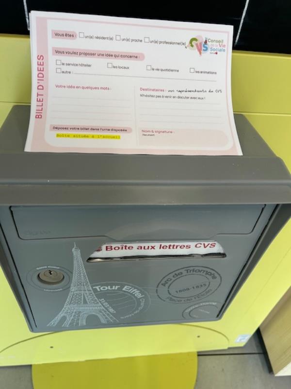 Comme évoqué dans le journal du mois de mars, des billets d’idées à destination du Conseil de la Vie Sociale (CVS) sont désormais à votre disposition à l’accueil de la résidence.