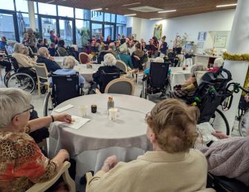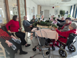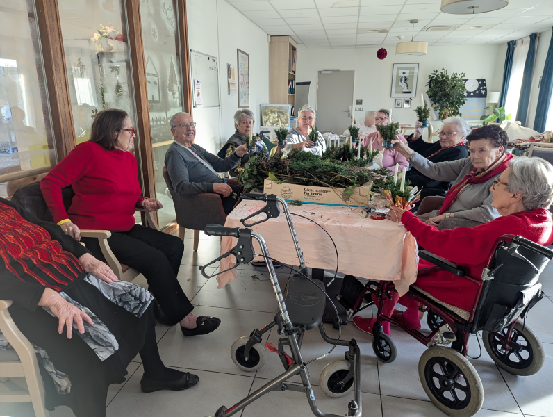 Les Résidents des Jardins de l'Aunette ont uni leurs forces cet après-midi dans la bonne humeur pour finir de réaliser de beaux centres de table composés de verdure et d’une bougie. Leur travail collectif a porté ses fruits : les créations sont prêtes à être vendues ce dimanche de 14h à 17h, au profit du Téléthon.