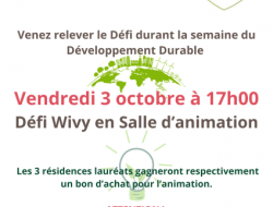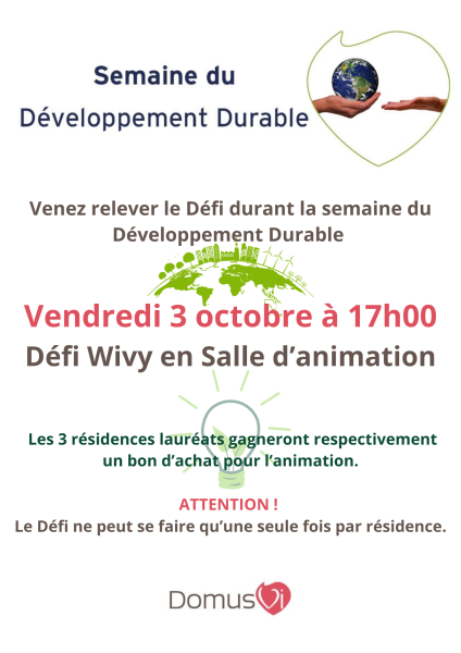 A l'occasion de la semaine du développement durable DomusVi organise un Défi Wivy où toutes les résidences sont invitées à participer. Les 3 résidences lauréats gagneront respectivement un bon d’achat pour l’animation !