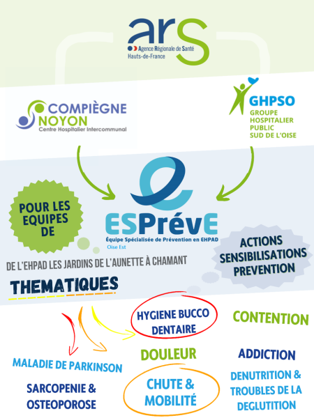 En cette fin l’année 2025, nous avons le plaisir de partager avec vous la collaboration de notre établissement avec une Equipe Spécialisée de Prévention inter-EHPAD (ESPrévE). Celle-ci vise à appuyer notre démarche de prévention auprès des résidents, en soutenant et accompagnant les équipes. Les thèmes de l’hygiène bucco-dentaire, de la prévention des chutes et du maintien de la mobilité ont été retenus comme axes de travail prioritaires.