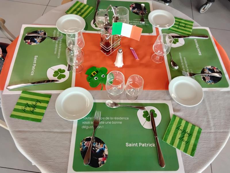 Aujourd’hui nous avons célébré la Saint-Patrick dans une ambiance chaleureuse et festive. Les résidents ont partagé un repas convivial aux couleurs de l’Irlande, ponctué de moments d’échange, de musique et de bonne humeur. Ce temps de fête a permis à chacun de voyager, le temps d’une journée, au cœur des traditions irlandaises.